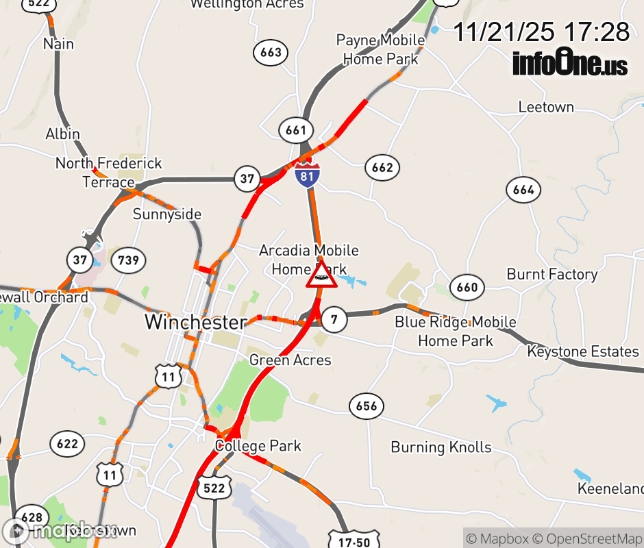 On I-81 North at mile marker 316.2 in the County of Frederick, motorists can expect delays due to a vehicle crash. Updated: Fri 11/21/25 5:28 PM EST ![]() Updated: Fri 11/21/25 5:28 PM EST |
