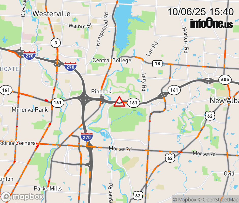The left lane is blocked on SR-161 West at I-270, due to a crash. Updated: Mon 10/6/25 3:40 PM EDT ![]() Updated: Mon 10/6/25 3:40 PM EDT |