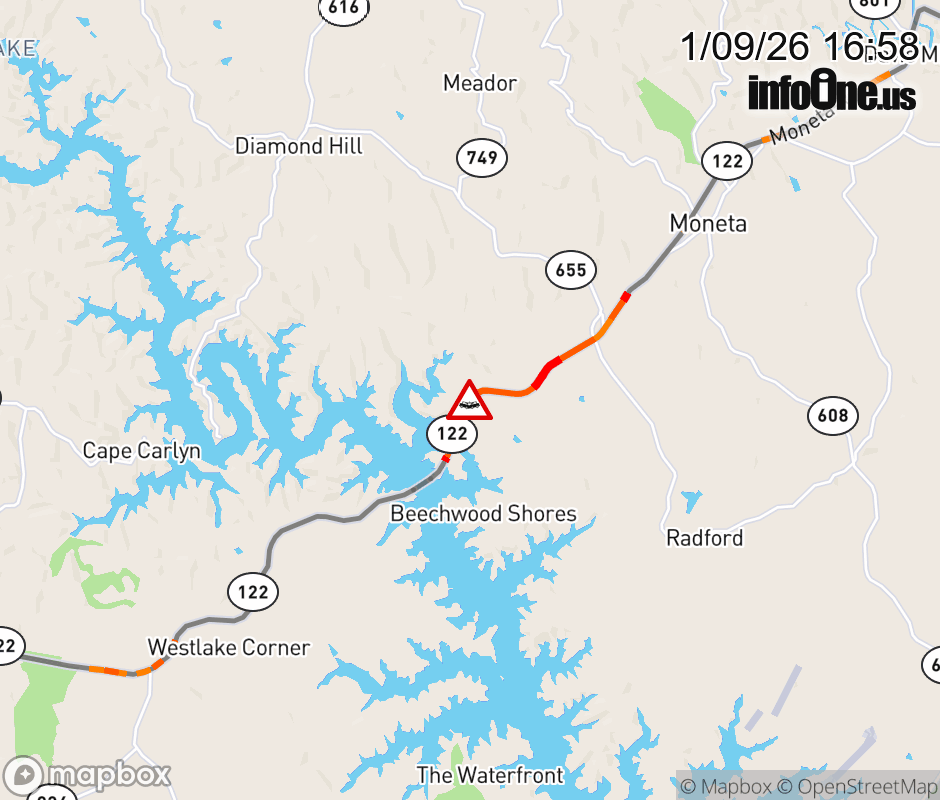 On VA-122 North in the County of Bedford, in the vicinity of Campers Paradise Trl, motorists can expect delays due to a vehicle crash. Lane closures exist. ![]() |