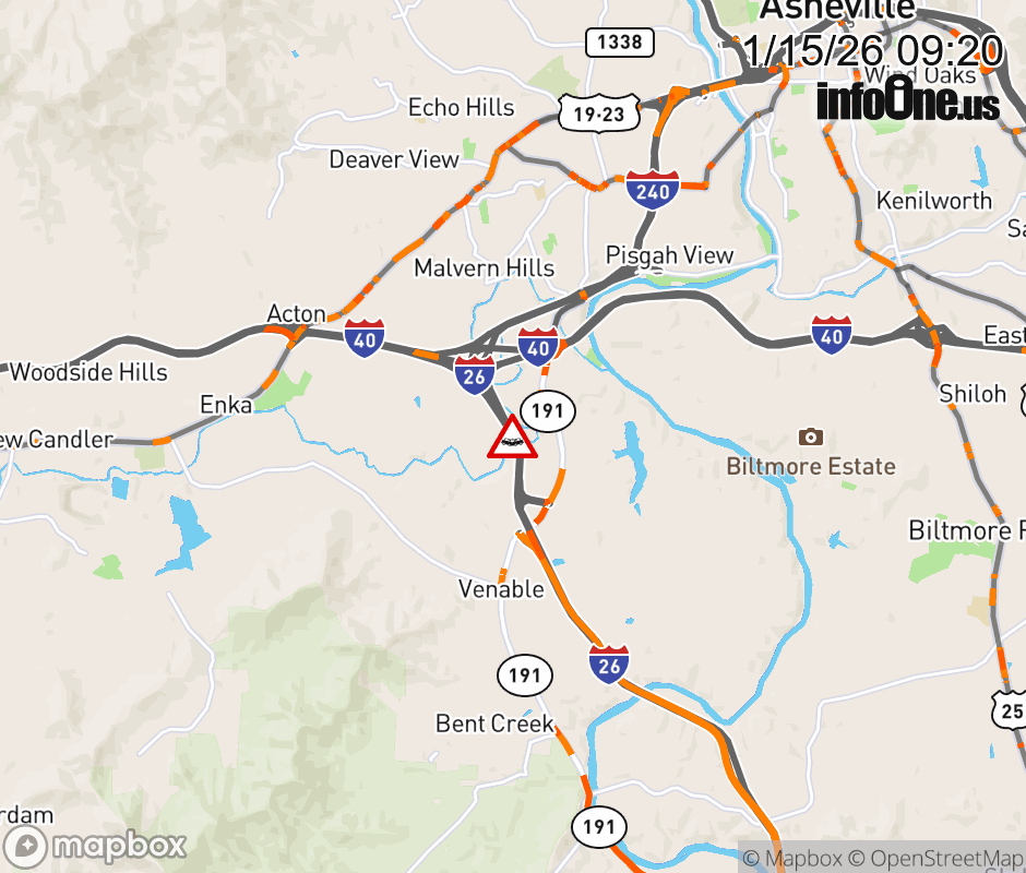 The left lane is closed 2 miles prior to Exit 33, NC 191 (Brevard Road) for a crash. Updated: Thu 1/15/26 9:20 AM EST ![]() Updated: Thu 1/15/26 9:20 AM EST |