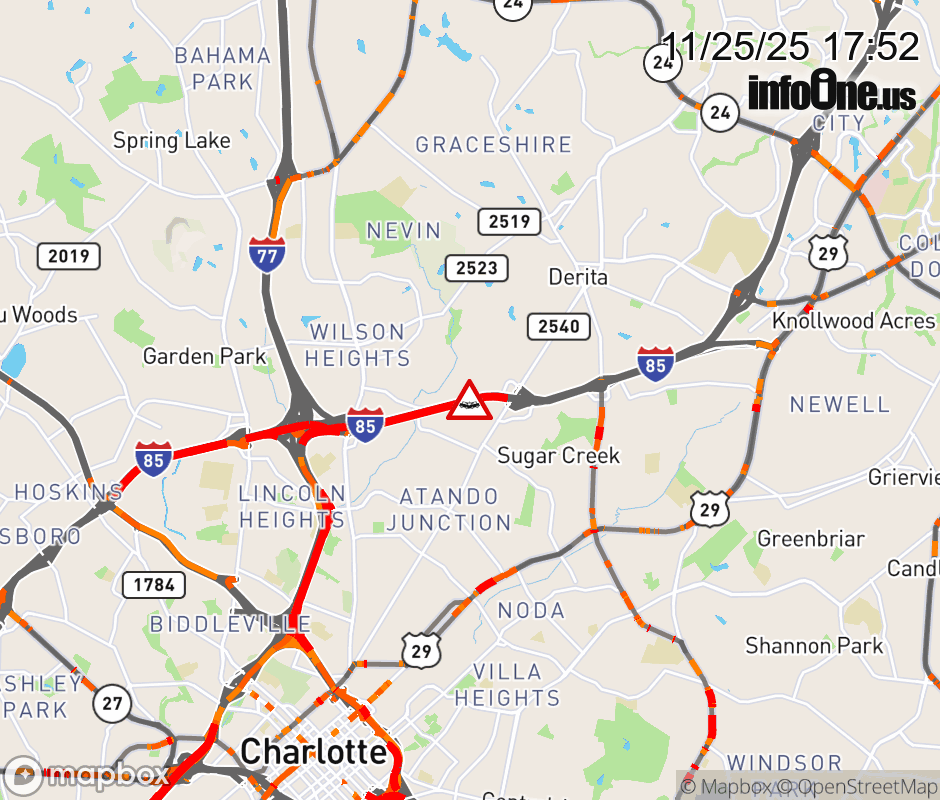 The left shoulder is closed prior to Exit 40 (Statesville Ave). Updated: Tue 11/25/25 5:52 PM EST ![]() Updated: Tue 11/25/25 5:52 PM EST |