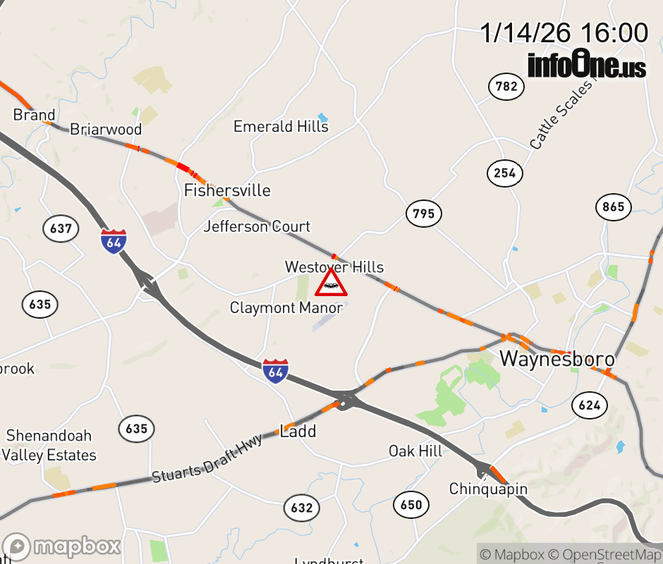 On Rt. 1136 East in the County of Augusta, in the vicinity of Rt. 1139N (Augusta County), motorists can expect delays due to a vehicle crash. Lane closures exist. ![]() |