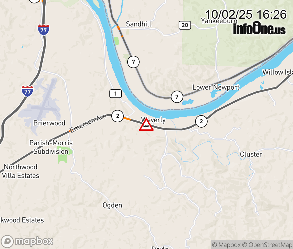 In Wood County there is a Vehicle Crash on WV-2 at Mile Marker 28.57. Emerson Ave & Ross Dr. ![]() |