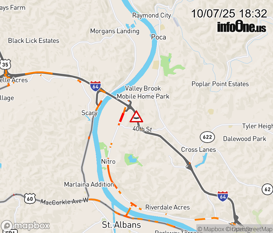 Vehicle Crash on I-64W at Mile Marker 45.0. The westbound right lane is closed. Updated: Tue 10/7/25 6:32 PM EDT ![]() Updated: Tue 10/7/25 6:32 PM EDT |