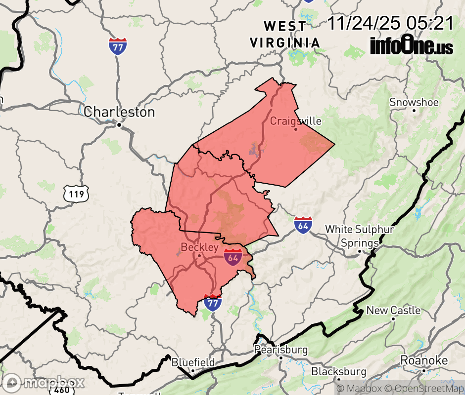 Canceled 11/24/25 10:00 AM Dense Fog Advisory issued November 24 at 5:18AM EST until November 24 at 10:00AM EST by NWS Charleston WV * WHAT... Visibility less than one mile in dense fog. * WHERE... Southeast Fayette, Southeast Nicholas, and Southeast Raleigh Counties. * WHEN... Until 10 AM EST this morning. * IMPACTS... Low visibility could make driving conditions hazardous. ![]() |