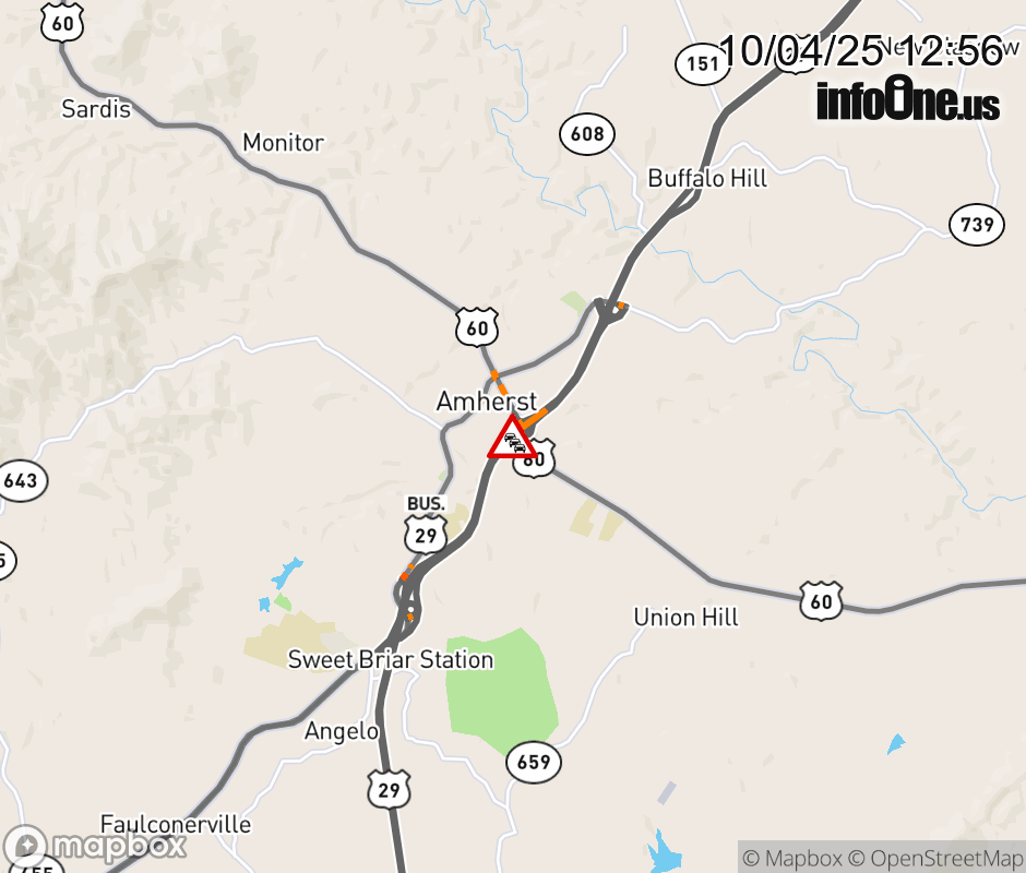 On US-29 in the County of Amherst, in the vicinity of the ramp from US 29; US 60, motorists can expect delays due to an incident. The south right lane and right shoulder are closed. Updated: Sat 10/4/25 12:56 PM EDT ![]() Updated: Sat 10/4/25 12:56 PM EDT |