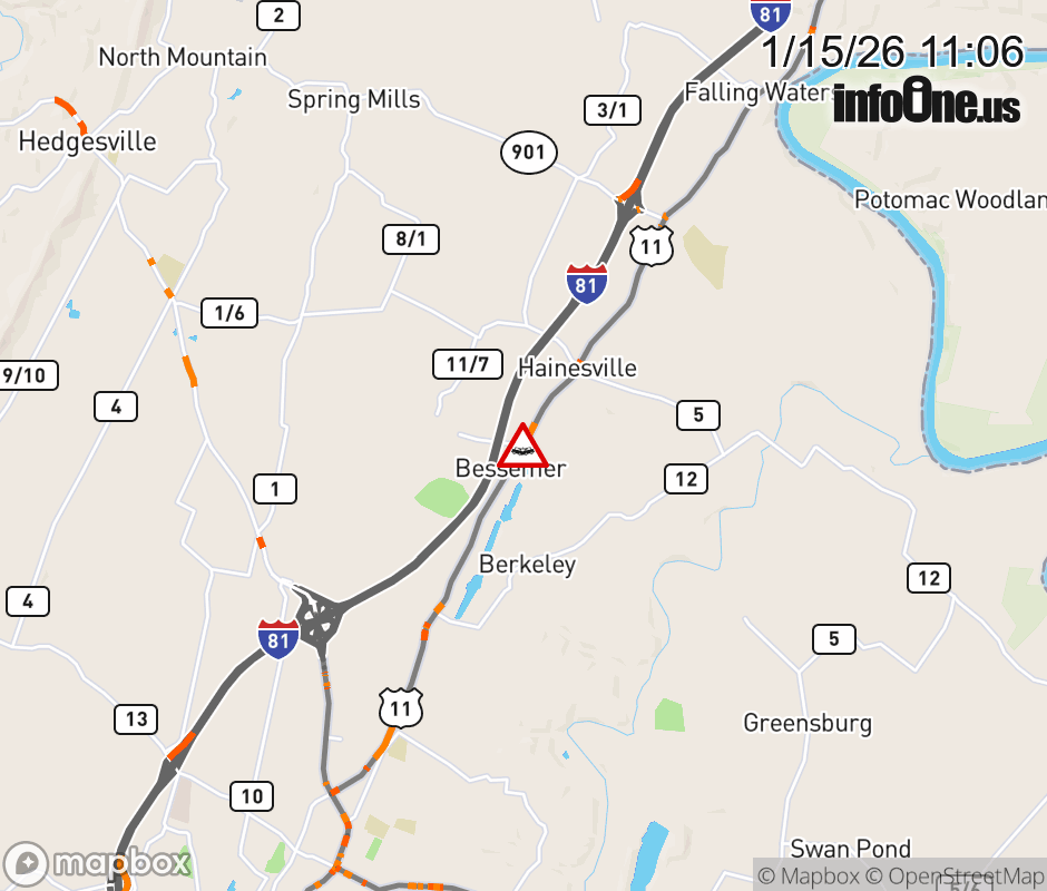 Vehicle Crash on US-11 (3300 BLK of Williamsport Pike) in Martinsburg. The northbound road is closed. The southbound road is closed. Updated: Thu 1/15/26 11:06 AM EST ![]() Updated: Thu 1/15/26 11:06 AM EST |