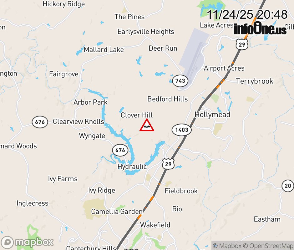 On Rt. 743 in the County of Albemarle, in the vicinity of Bradford Ln; Rt. 1565N/S (Albemarle County), motorists can expect delays due to a vehicle crash. All north lanes are closed. All south lanes are closed. ![]() |