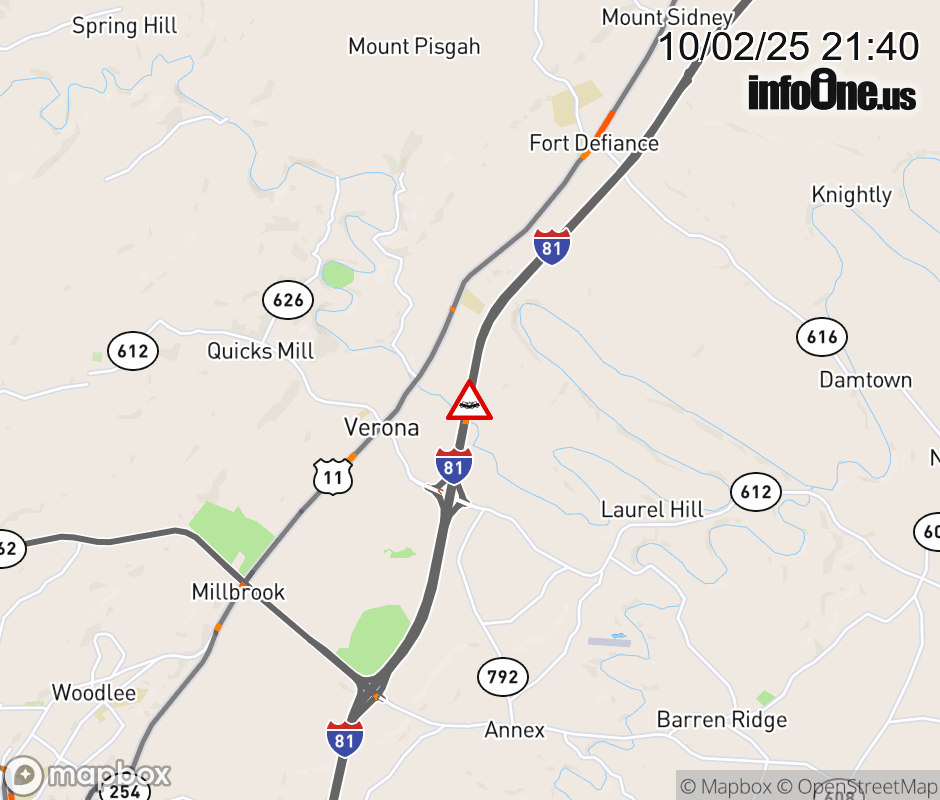 On I-81 North at mile marker 228.4 in the County of Augusta, motorists can expect delays due to a tractor trailer crash. Updated: Thu 10/2/25 9:40 PM EDT ![]() Updated: Thu 10/2/25 9:40 PM EDT |