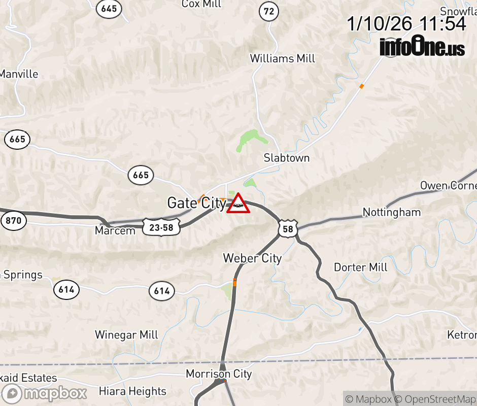 On US-23 North in the Town of Gate City, in the vicinity of Kane St; BUS US-58E, BUS US-23N/S; BUS US-23N/S, BUS US-58E, motorists can expect delays due to a vehicle crash. Lane closures exist. ![]() |