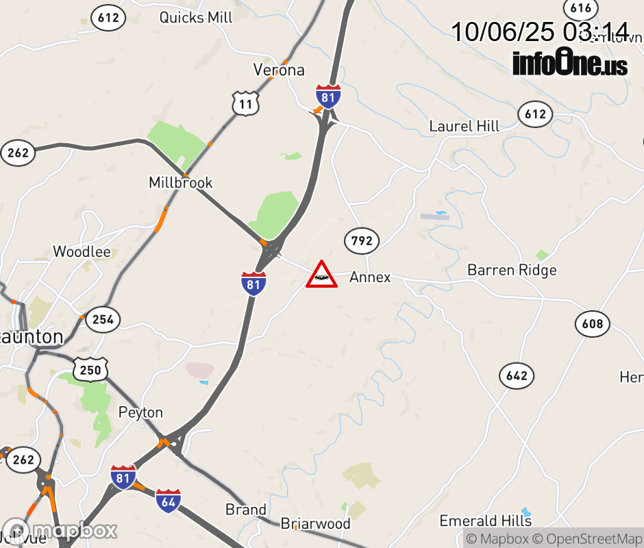 On VA-254 East in the County of Augusta, in the vicinity of Woodrow Wilson Pkwy; VA-262E/W, motorists can expect delays due to a vehicle crash. Lane closures exist. Updated: Mon 10/6/25 3:14 AM EDT ![]() Updated: Mon 10/6/25 3:14 AM EDT |