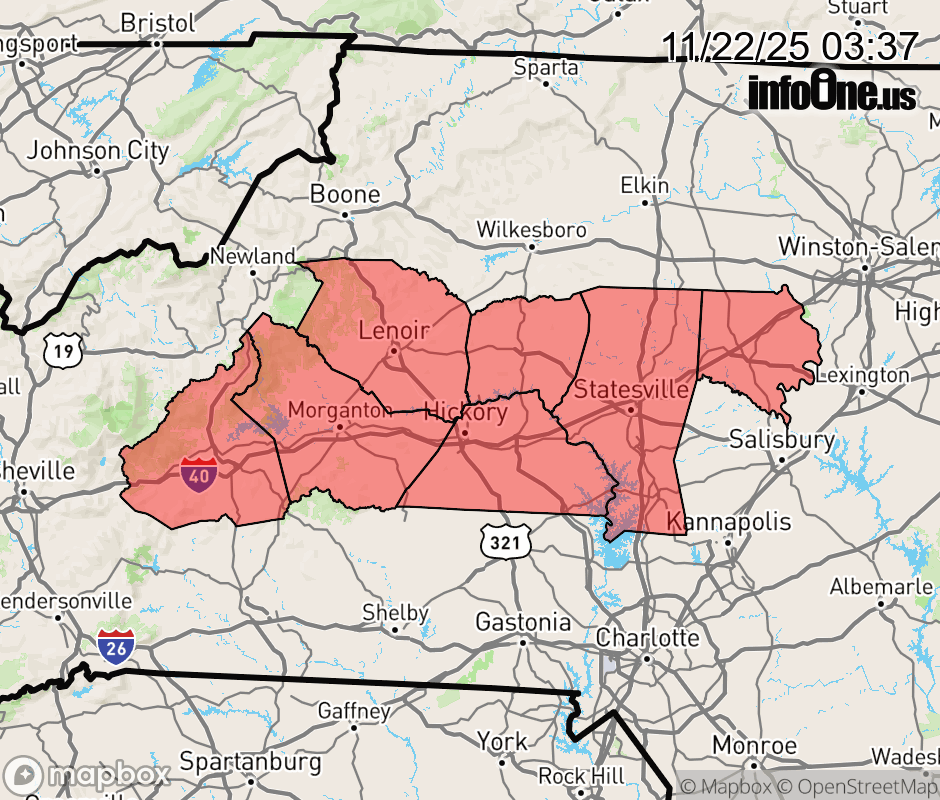 Canceled 11/22/25 7:00 AM Dense Fog Advisory issued November 22 at 3:36AM EST until November 22 at 7:00AM EST by NWS Greenville-Spartanburg SC * WHAT... Visibility one quarter mile or less in dense fog. * WHERE... Alexander, Catawba, Davie, Iredell, Burke Mountains, Caldwell Mountains, Eastern McDowell, Greater Burke, Greater Caldwell, and McDowell Mountains Counties. * WHEN... Until 7 AM EST this morning. * IMPACTS... Low visibility could make driving conditions hazardous. ![]() |