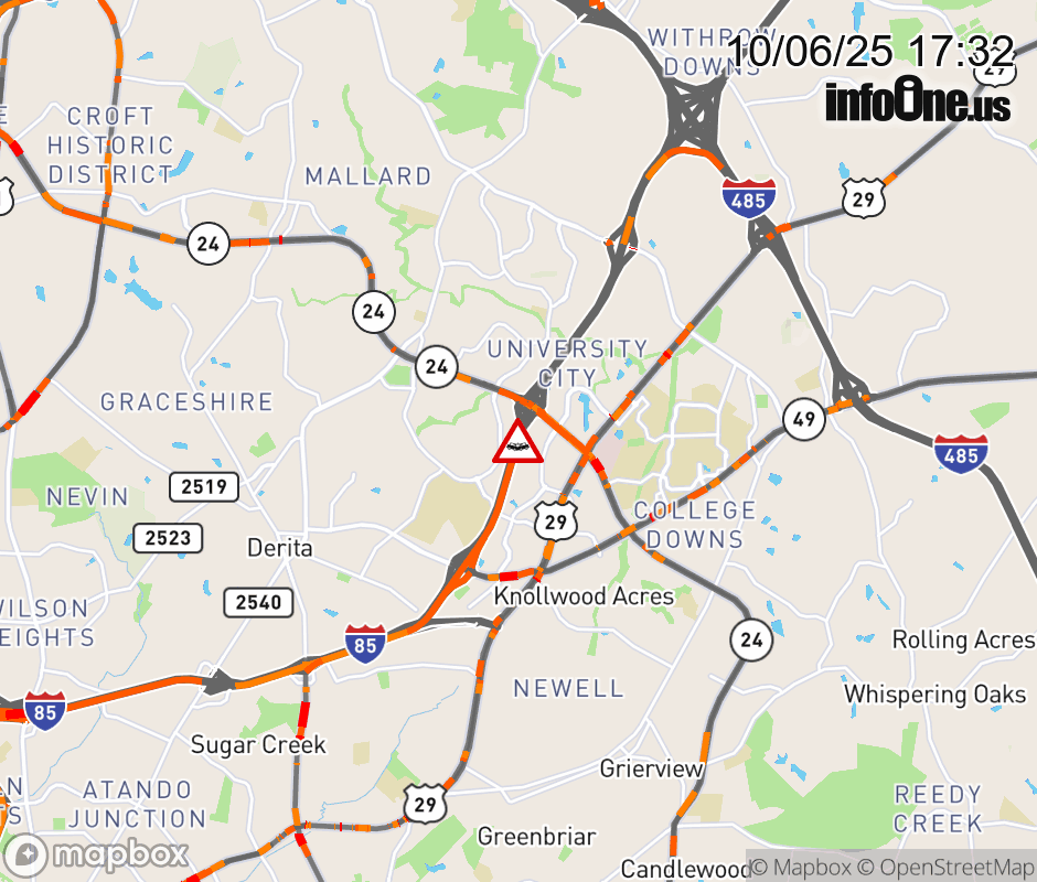 The left lane is closed prior to Exit 45A (W W. T. Harris Blvd). Updated: Mon 10/6/25 5:32 PM EDT ![]() Updated: Mon 10/6/25 5:32 PM EDT |
