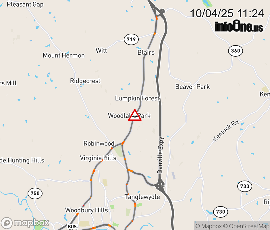 On BUS US-29 North in the County of Pittsylvania, in the vicinity of Woodlake Dr; Rt. 1502E/W (Pittsylvania County), motorists can expect delays due to a vehicle crash. Lane closures exist. ![]() |