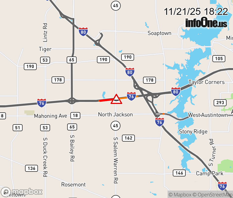 The left lane is blocked on I-76 East beyond To SR-45/Bailey Rd/Warren, due to a crash. Updated: Fri 11/21/25 6:22 PM EST ![]() Updated: Fri 11/21/25 6:22 PM EST |