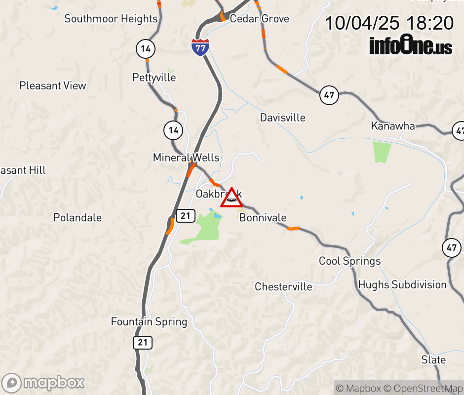 In Wood County there is a Vehicle Crash on WV-14 at Mile Marker 5.98. 1500 BLK of Elizabeth Pike in Mineral Wells. ![]() |