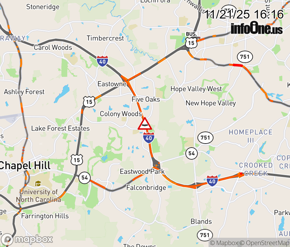 The left shoulder is closed near Exit 271 (NC 54). ![]() |