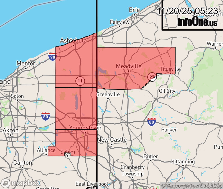 Canceled 11/20/25 8:50 AM Freezing Fog Advisory issued November 20 at 5:21AM EST until November 20 at 9:00AM EST by NWS Cleveland OH * WHAT... Visibility one quarter mile or less in freezing fog. * WHERE... In Ohio, Ashtabula Inland, Mahoning, and Trumbull Counties. In Pennsylvania, Crawford County. * WHEN... Until 9 AM EST this morning. * IMPACTS... Low visibility and a light glaze of ice, especially on bridges and overpasses could make driving conditions hazardous. ![]() |