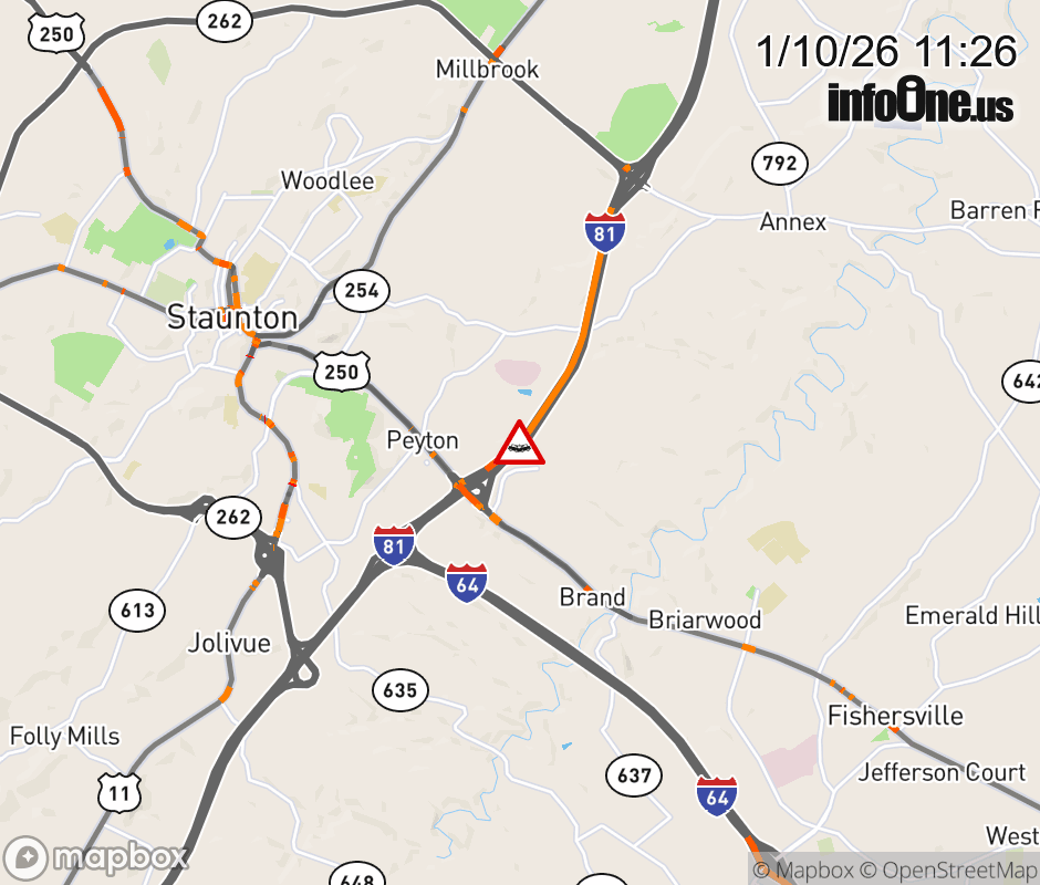On I-81 South at mile marker 223.2 in the County of Augusta, motorists can expect delays due to a vehicle crash. Traffic backups are approximately 2.0 miles. Updated: Sat 1/10/26 11:26 AM EST ![]() Updated: Sat 1/10/26 11:26 AM EST |