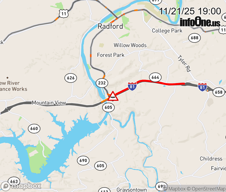 On I-81 at mile marker 105.4 in the County of Montgomery, motorists can expect delays due to a vehicle crash. The south right shoulder is closed. Updated: Fri 11/21/25 7:00 PM EST ![]() Updated: Fri 11/21/25 7:00 PM EST |