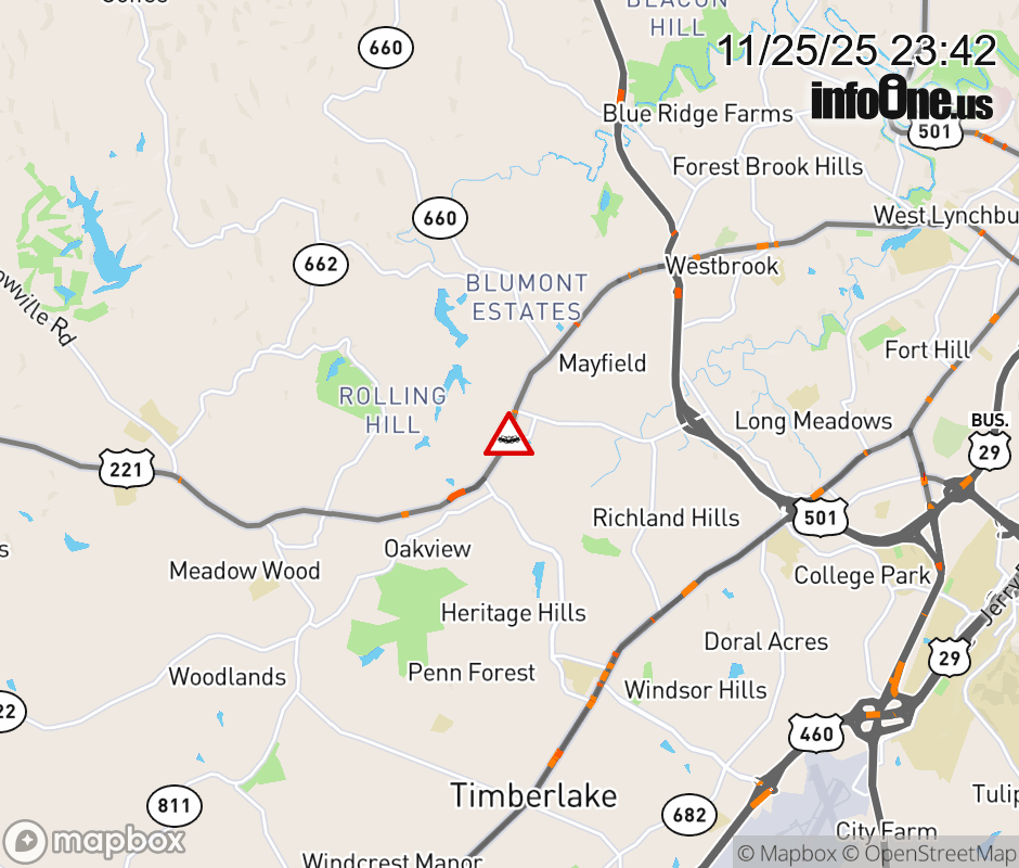 On Rt. 1426 East in the County of Bedford, in the vicinity of Forest Rd; US-221N/S, motorists can expect delays due to a vehicle crash. Lane closures exist. ![]() |