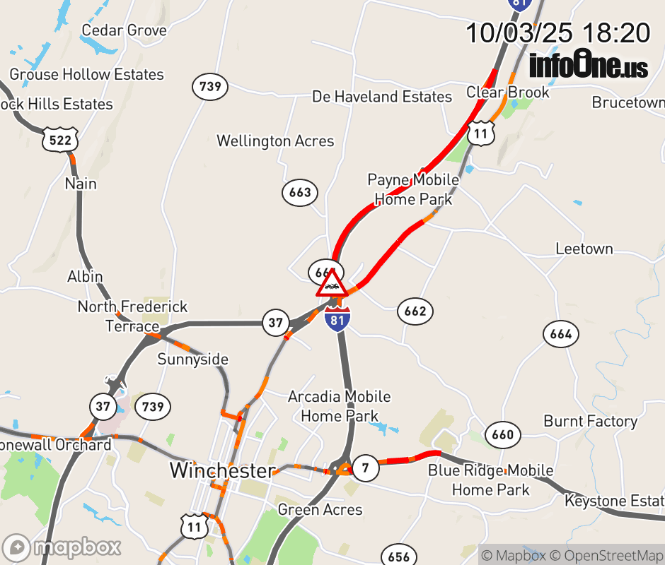 On I-81 South at mile marker 318 in the County of Frederick, motorists can expect delays due to a disabled tractor trailer. Traffic backups are approximately 3.5 miles. Updated: Fri 10/3/25 6:20 PM EDT ![]() Updated: Fri 10/3/25 6:20 PM EDT |