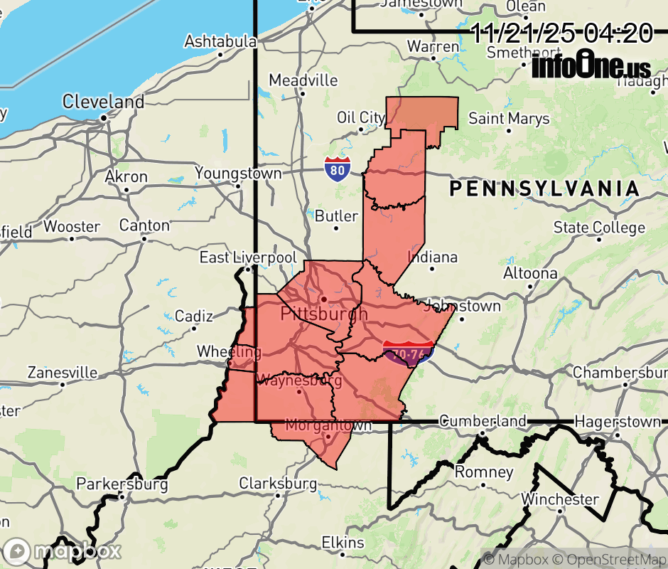 Canceled 11/21/25 9:00 AM Dense Fog Advisory issued November 21 at 4:19AM EST until November 21 at 9:00AM EST by NWS Pittsburgh PA * WHAT... Visibility one quarter mile or less in dense fog. * WHERE... Portions of northwest, southwest, and western Pennsylvania and northern and the northern panhandle of West Virginia. * WHEN... Until 9 AM EST this morning. * IMPACTS... Low visibility could make driving conditions hazardous. ![]() |