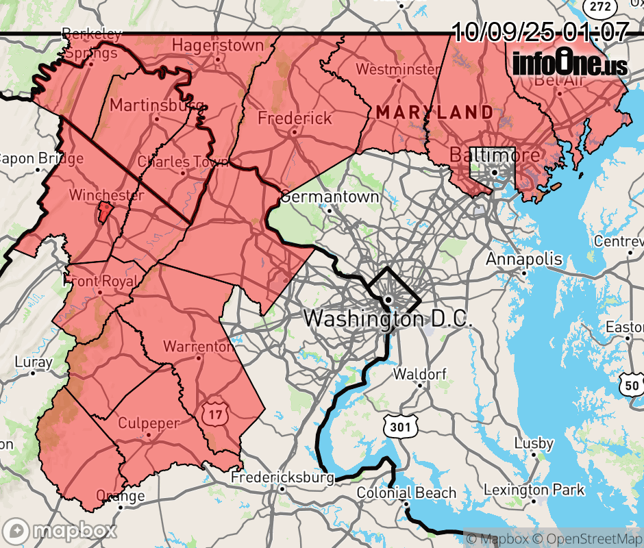 Frost Advisory issued October 9 at 1:06AM EDT until October 10 at 9:00AM EDT by NWS Baltimore MD/Washington DC * WHAT... Temperatures as low as 33 will result in frost formation. * WHERE... Portions of north central and northern Maryland, northern and northwest Virginia, and the panhandle of West Virginia. * WHEN... From 2 AM to 9 AM EDT Friday. * IMPACTS... Frost could harm sensitive outdoor vegetation. Sensitive outdoor plants may be killed if left uncovered. ![]() |
