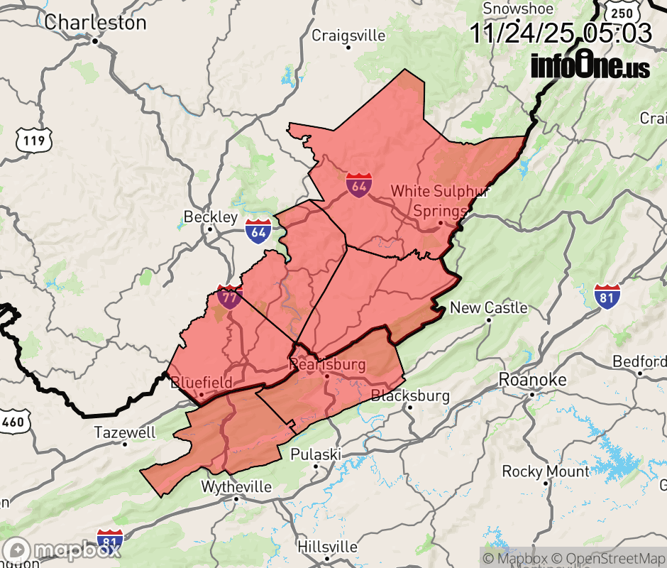 Canceled 11/24/25 9:00 AM Dense Fog Advisory issued November 24 at 5:01AM EST until November 24 at 9:00AM EST by NWS Blacksburg VA * WHAT... Visibility one quarter mile or less in dense fog. * WHERE... In Virginia, Bland and Giles Counties. In West Virginia, Eastern Greenbrier, Mercer, Monroe, Summers, and Western Greenbrier Counties. * WHEN... Until 9 AM EST this morning. * IMPACTS... Low visibility could make driving conditions hazardous. ![]() |