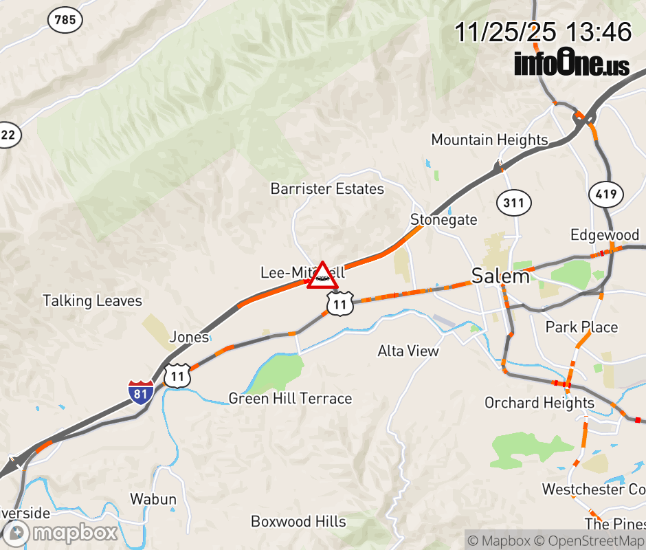 On I-81 at mile marker 137.2 in the County of Roanoke, motorists can expect delays due to a vehicle crash. The north left shoulder is closed. Updated: Tue 11/25/25 1:46 PM EST ![]() Updated: Tue 11/25/25 1:46 PM EST |