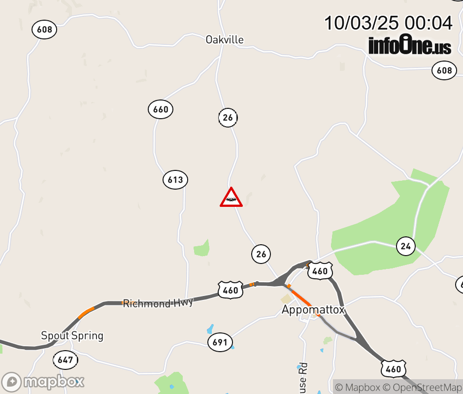 On VA-26 in the County of Appomattox, in the vicinity of Phelps Branch Rd; Rt. 659E/W (Appomattox County), motorists can expect delays due to a vehicle crash. All north lanes are closed. ![]() |