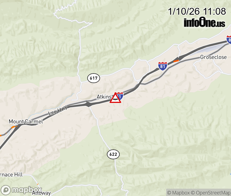 On I-81 at mile marker 51.9 in the County of Smyth, motorists can expect delays due to a vehicle crash. The south right shoulder is closed. Updated: Sat 1/10/26 11:08 AM EST ![]() Updated: Sat 1/10/26 11:08 AM EST |