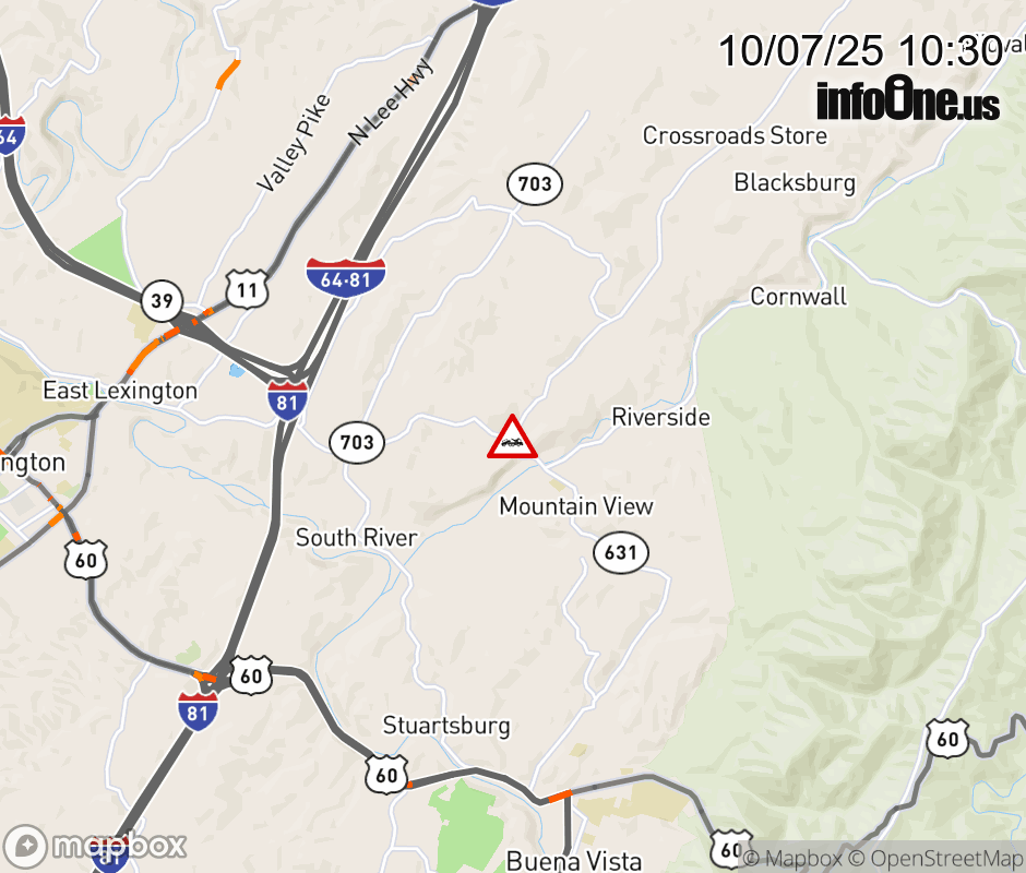 On Rt. 706 in the County of Rockbridge, in the vicinity of Old Buena Vista Rd; Rt. 631E/W (Rockbridge County), motorists can expect delays due to a disabled tractor trailer. All north lanes are closed. All south lanes are closed. ![]() |