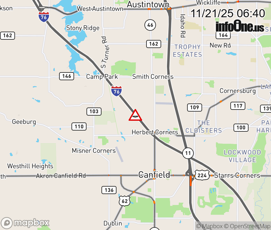 Expect lane closures on I-76 East (Ohio Turnpike) beyond I-76/80, due to a crash. Updated: Fri 11/21/25 6:40 AM EST ![]() Updated: Fri 11/21/25 6:40 AM EST |