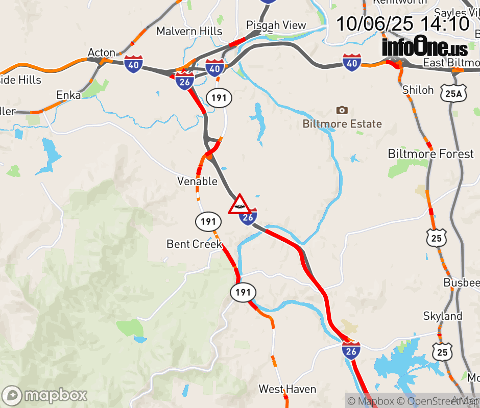 The left lane is closed two miles east of Exit 33, NC 191 (Brevard Road). Updated: Mon 10/6/25 2:10 PM EDT ![]() Updated: Mon 10/6/25 2:10 PM EDT |