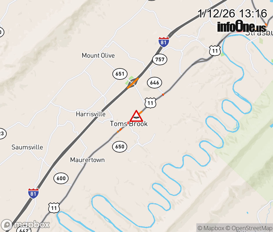 On US-11 in the County of Shenandoah, in the vicinity of Jessica Pl; Rt. 1500N/S (Shenandoah County), motorists can expect delays due to a vehicle crash. All north lanes are closed. ![]() |