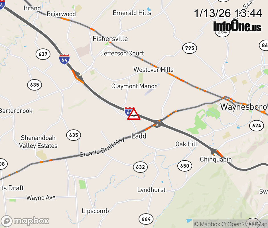 On I-64 at mile marker 93.8 in the County of Augusta, motorists can expect delays due to a vehicle crash. The east right lane and right shoulder are closed. ![]() |