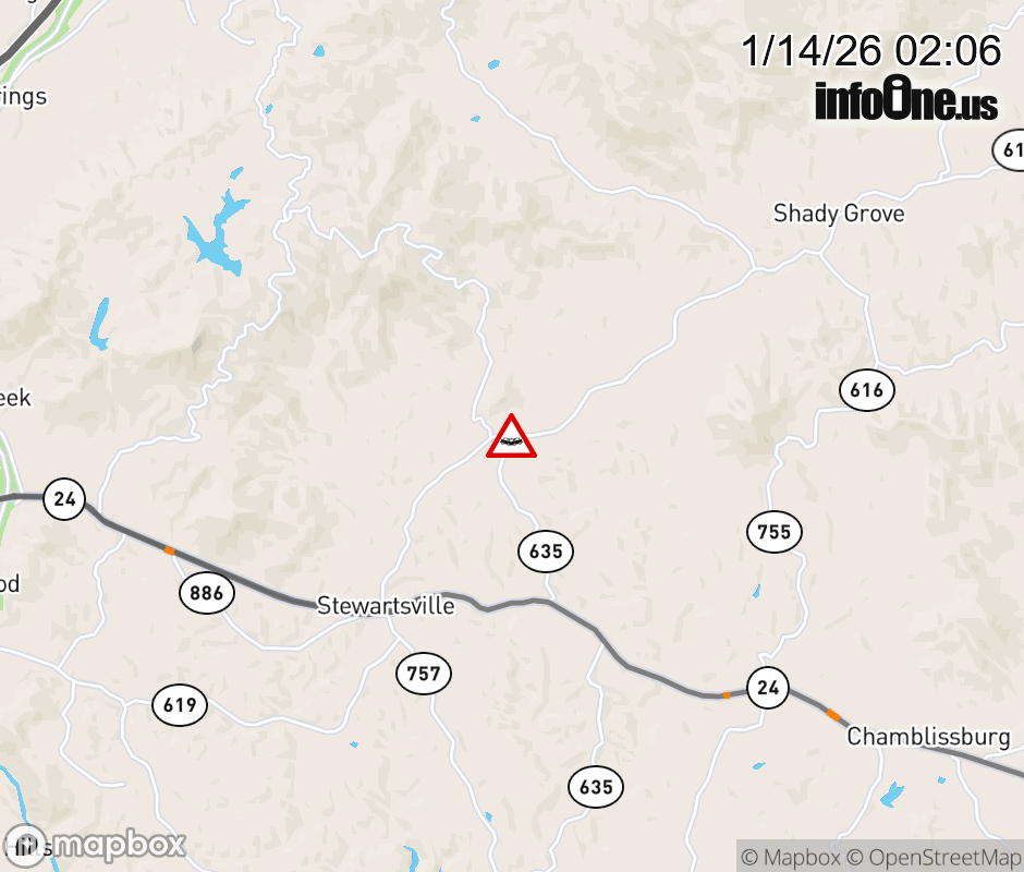 On Rt. 619 in the County of Bedford, in the vicinity of Lovers Ln; Rt. 635N/S (Bedford County), motorists can expect delays due to a vehicle crash. All east lanes are closed. All west lanes are closed. ![]() |