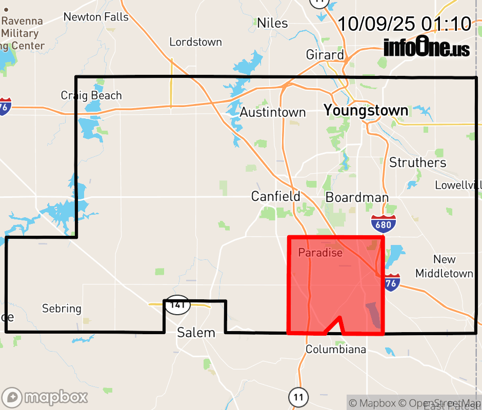 Canceled 10/9/25 1:20 AM Mahoning County has 3 power outages affecting 81 customers. Ohio Edison 81 without power Beaver Township: Customers affected: 81 (3%) Estimated repair: Thu 3:30 AM Updated: Thu 10/9/25 1:10 AM EDT ![]() Updated: Thu 10/9/25 1:10 AM EDT |