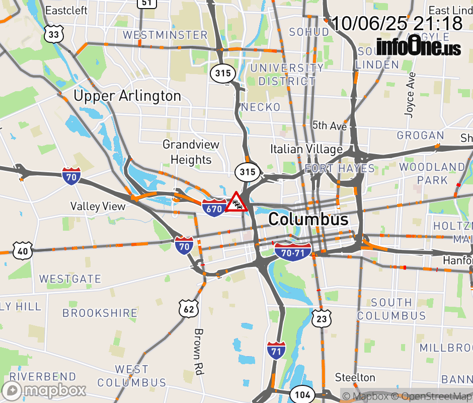 The 2 left lanes are blocked on I-670 West beyond SR-315 South, due to repairs/maintenance. Updated: Mon 10/6/25 9:18 PM EDT ![]() Updated: Mon 10/6/25 9:18 PM EDT |