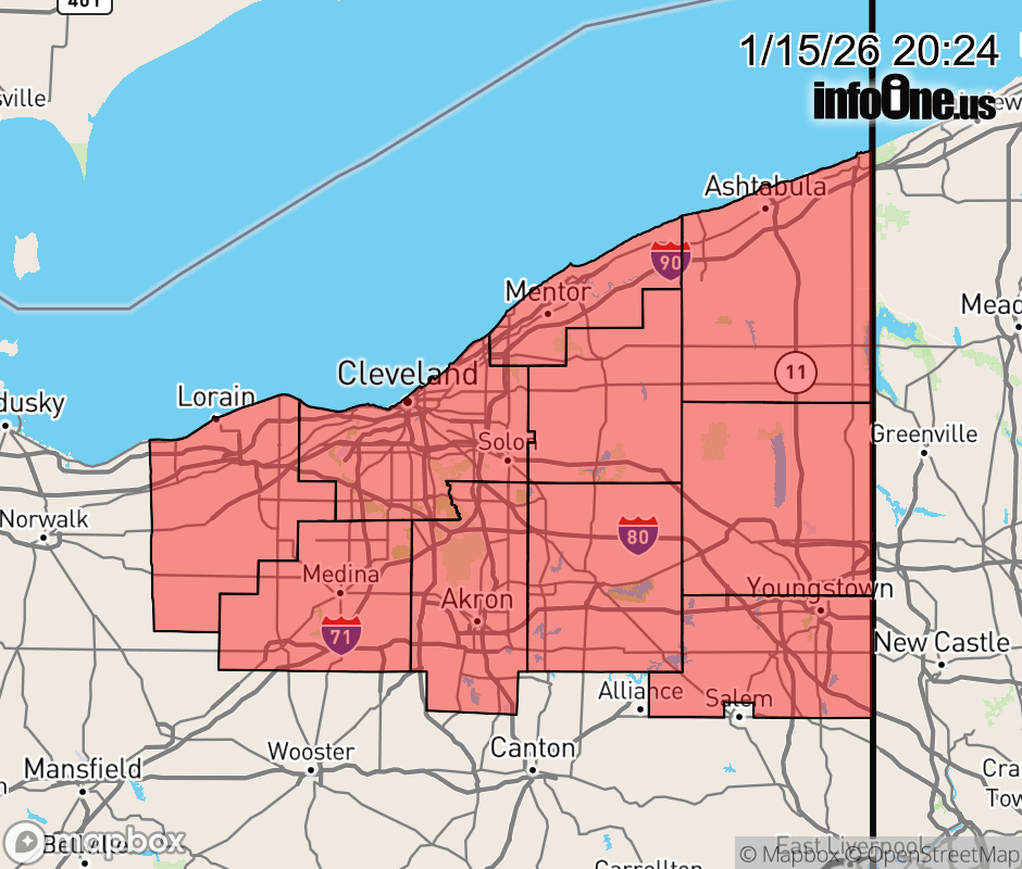 Canceled 1/16/26 12:00 AM Special Weather Statement issued January 15 at 8:22PM EST by NWS Cleveland OH Temperatures will continue to fall this evening into the single digits to low teens with clearing skies. Roads and bridges that have been cleared will still be wet and could refreeze creating slick spots. Use caution and plan on giving yourself extra time to reach your destination this evening if traveling. ![]() |
