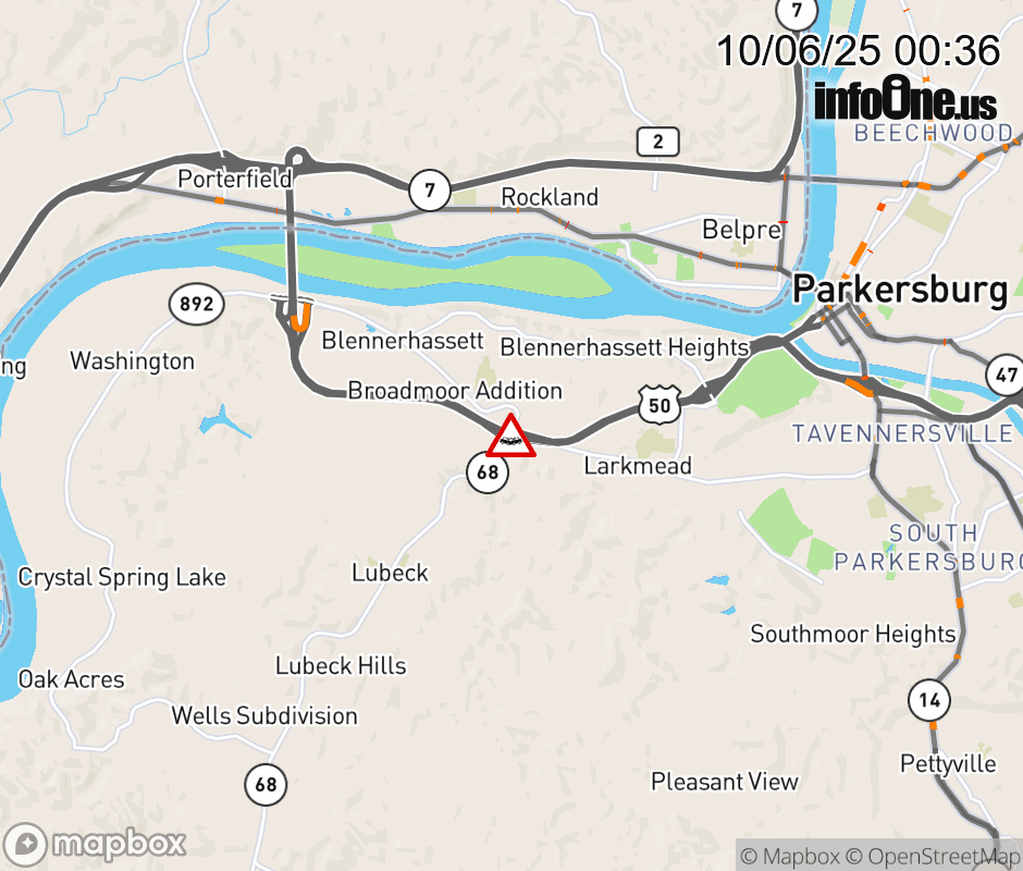 In Wood County there is a Vehicle Crash on US-50W at Mile Marker 3.15. WV-68 (Dupont Road) & US-50 (Northwestern Turnpike). ![]() |