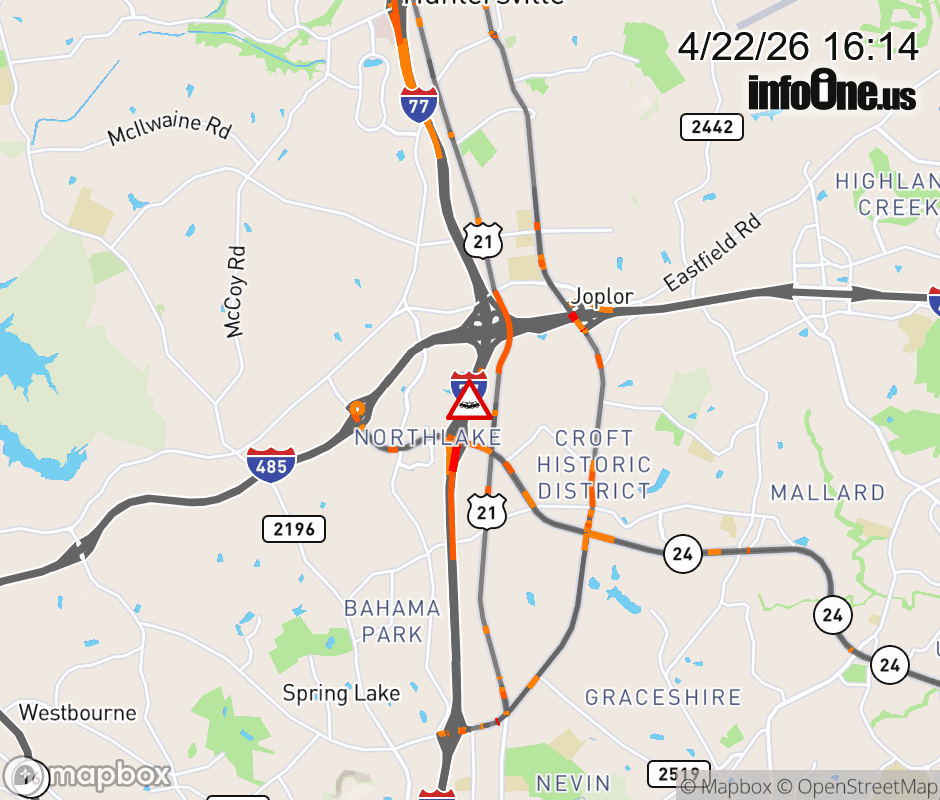 The right shoulder is closed after Exit 18 (W.W.T. Harris Blvd). Updated: Wed 4/22/26 4:14 PM EDT ![]() Updated: Wed 4/22/26 4:14 PM EDT |