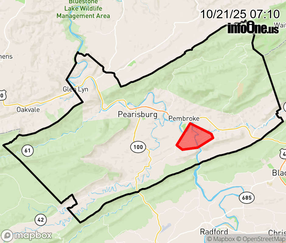 Canceled 10/21/25 7:30 AM Giles County has 1 power outage affecting 260 customers. Appalachian Power 260 without power Pembroke: Customers affected: 143 (8%) Eggleston: Customers affected: 117 (81%) ![]() |
