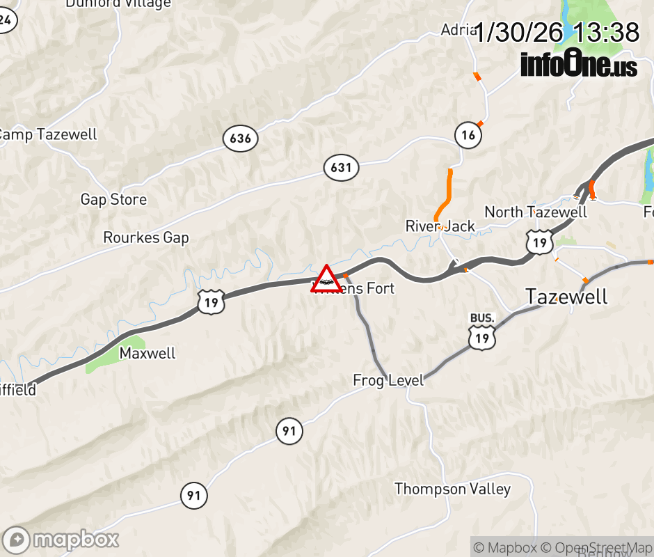 On US-19 in the County of Tazewell, in the vicinity of Crab Orchard Rd; BUS US-460E, BUS US-19E/W, BUS US-19E/W (2 Tazewell); Rt. 632E/W (Tazewell County), motorists can expect delays due to a vehicle crash. The north right lane and right shoulder are closed. ![]() |