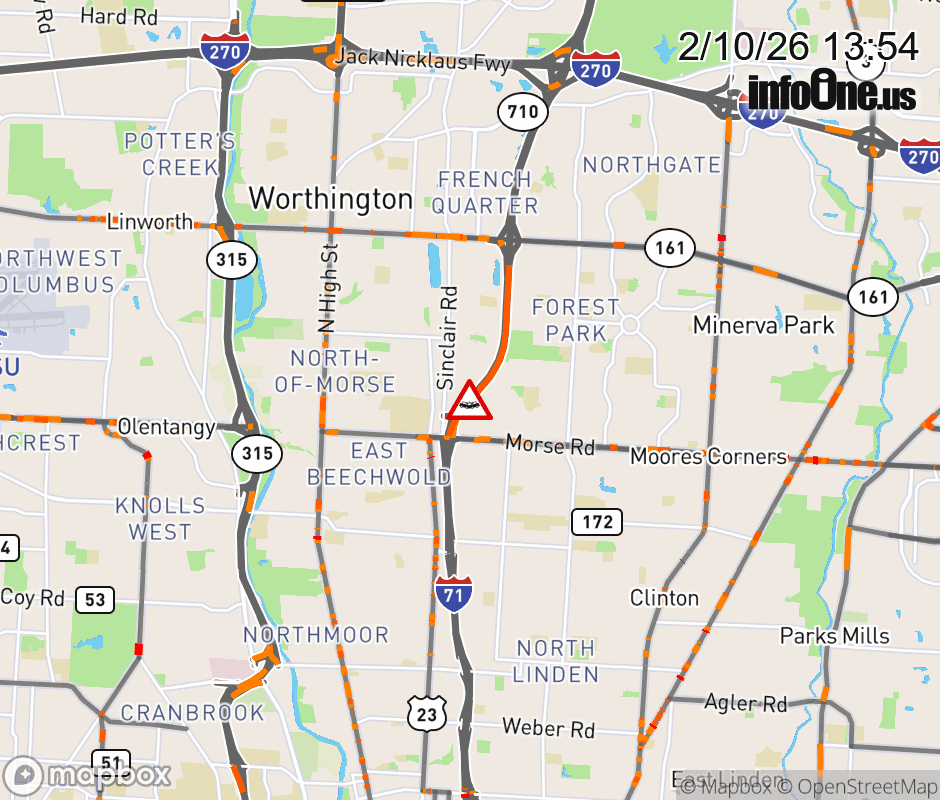The right shoulder is blocked on I-71 North beyond Morse Rd/Sinclair Rd, due to a crash. Updated: Tue 2/10/26 1:54 PM EST ![]() Updated: Tue 2/10/26 1:54 PM EST |