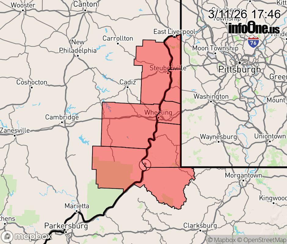 Canceled 3/11/26 6:02 PM Tornado Watch issued March 11 at 5:45PM EDT until March 11 at 8:00PM EDT by NWS Pittsburgh PA TORNADO WATCH 42 REMAINS VALID UNTIL 8 PM EDT THIS EVENING FOR THE FOLLOWING AREAS IN OHIO THIS WATCH INCLUDES 3 COUNTIES IN EAST CENTRAL OHIO BELMONT JEFFERSON OH MONROE IN WEST VIRGINIA THIS WATCH INCLUDES 5 COUNTIES IN NORTHERN WEST VIRGINIA WETZEL IN THE NORTHERN PANHANDLE OF WEST VIRGINIA BROOKE HANCOCK MARSHALL OHIO THIS INCLUDES THE CITIES OF FOLLANSBEE, MARTINS FERRY, MOUNDSVILLE, NEW MARTINSVILLE, ST. CLAIRSVILLE, STEUBENVILLE, WEIRTON, WELLSBURG, WHEELING, AND WOODSFIELD. ![]() |