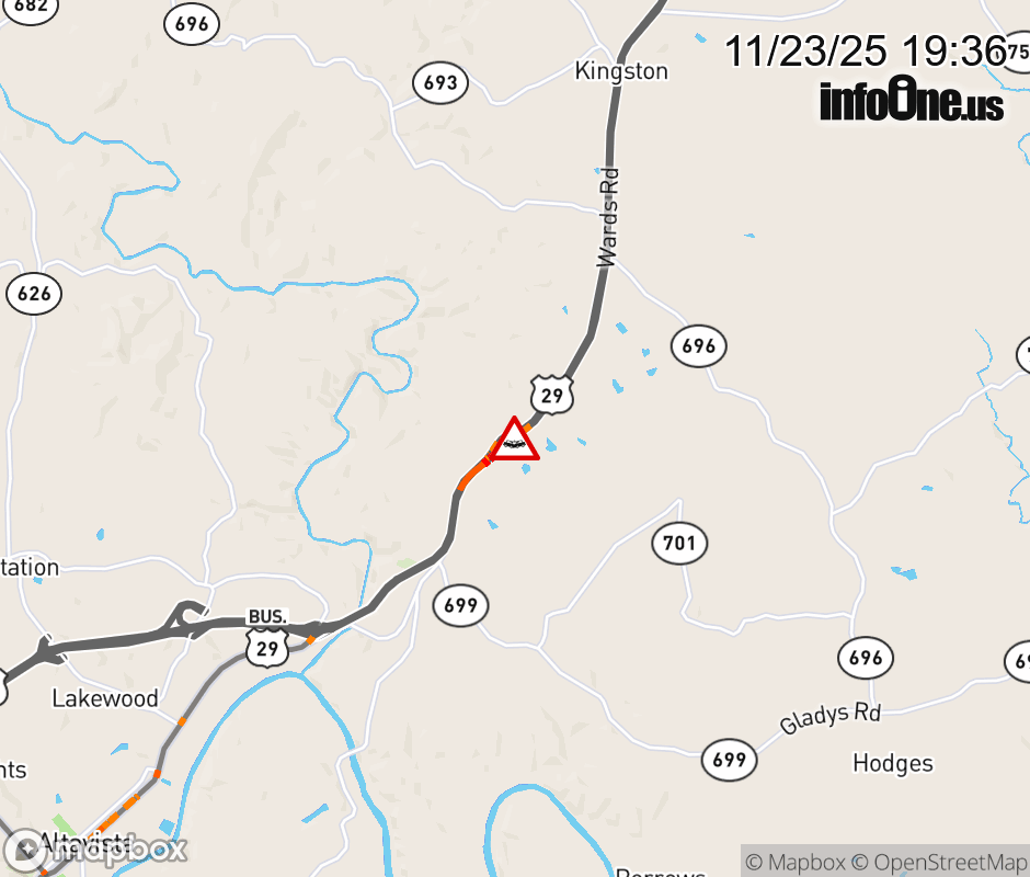 On US-29 in the County of Campbell, in the vicinity of Old Devils Step Rd; Peerman School Rd; Wards Rd; Rt. 734E/W (Campbell County), motorists can expect delays due to a tractor trailer crash. The north left shoulder and left lane are closed. Updated: Sun 11/23/25 7:36 PM EST ![]() Updated: Sun 11/23/25 7:36 PM EST |