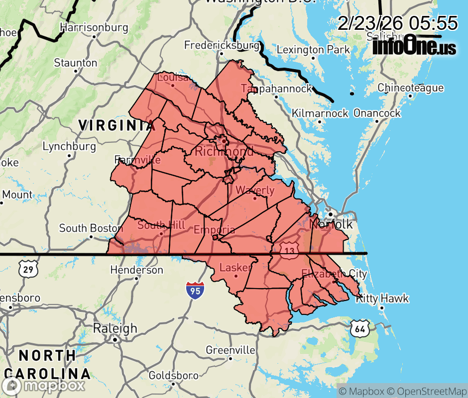 Canceled 2/23/26 9:00 AM Special Weather Statement issued February 23 at 5:53AM EST by NWS Wakefield VA As temperatures fall below freezing this morning, any lingering moisture on untreated surfaces such as roads, bridges, overpasses, and sidewalks may freeze. This could lead to hazardous travel conditions, so use caution if on the roads this morning. Temperatures rise above freezing by 9 AM. ![]() |