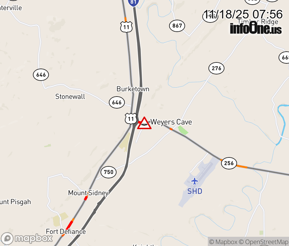 On VA-256 East in the County of Augusta, in the vicinity of Triangle Dr; Rt. 2011N/S (Augusta County), motorists can expect delays due to a vehicle crash. Updated: Tue 11/18/25 7:56 AM EST ![]() Updated: Tue 11/18/25 7:56 AM EST |
